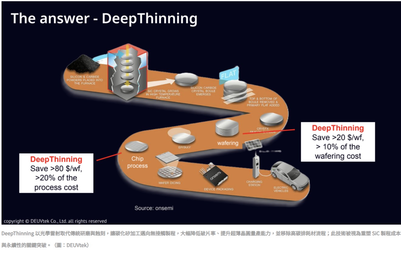 在量化成果方面,DeepThinning 使破片率從傳統的約 3% 降至 0.1% 以下,使 50 µm 以下超薄晶圓得以穩定量產,也因耗材使用的消失而使製程成本下降約 20%。此外,高碳排的鑽石砂輪、油水清洗與耗材廢棄流程也隨之被完全移除,使碳化矽生產邁向真正可持續的模式。